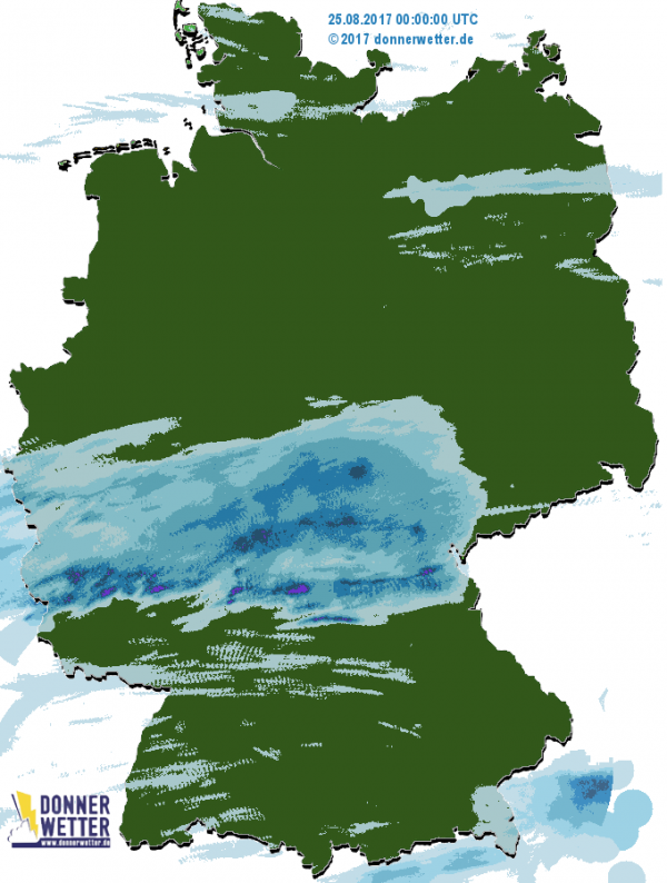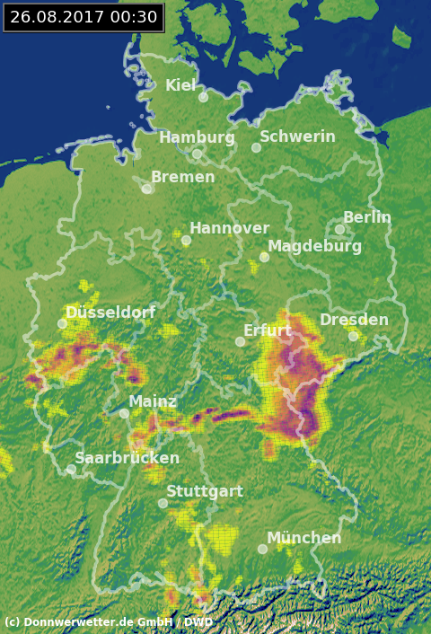 Das Radarbild zeigt momentan über der Mitte stärkere Schauer- und Gewittersignale, die allmählich von West nach Ost wandern. Sonst ist der Himmel über Deutschland teils bewölkt, teils klar. Stellenweise haben sich Nebelfelder gebildet.