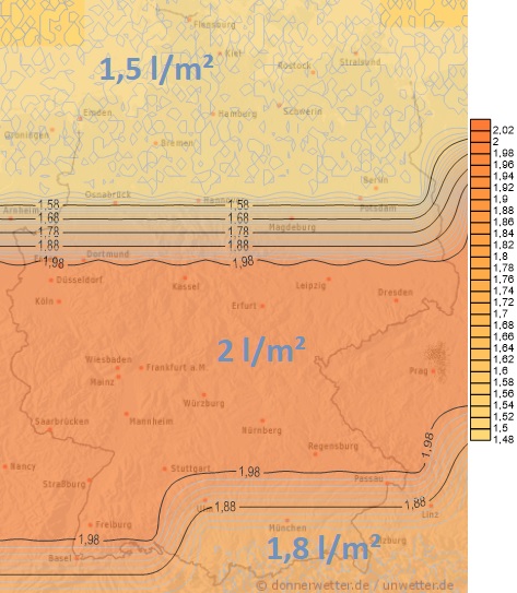 Am Donnerstag überquert uns die Kaltfront von Nordwest nach Südost mit weiteren teils kräftigen gewittrigen Regenfällen, lokal drohen Unwetter mit Überschwemmungen.