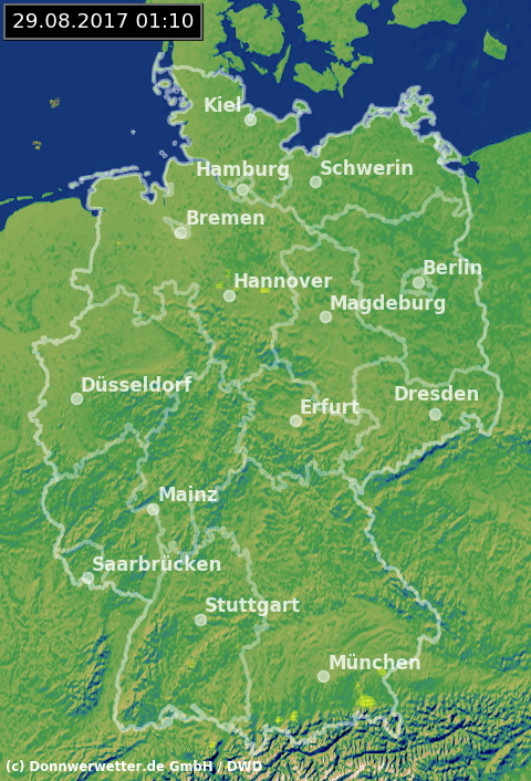 Das Radarbild zeigt momentan keine Niederschlagssignale an. Der Himmel über Deutschland ist überwiegend sternenklar, oder nur leicht bewölkt. Stellenweise haben sich Nebelfelder gebildet.