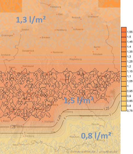 Heute und am Samstag muss ganz im Süden mit kräftigen Regenfällen und örtlichen Überschwemmungen gerechnet werden. Stellenweise können an beiden Tagen zwischen 25 und 50 Liter Niederschlag pro Quadratmeter fallen. Sonst treten gebietsweise Schauer auf, in der Größenordnung von etwa 5 bis 10 Liter pro Quadratmeter.