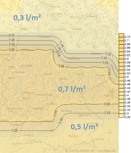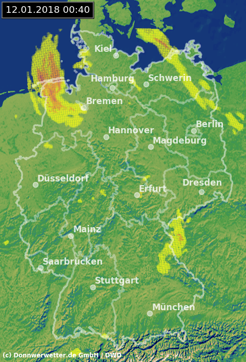Das Radarbild zeigt aktuell über dem Emsland noch leichte bis mäßige, sonst nur einzelne leichte Signale mit Regen und Sprühregen. Der Himmel über Deutschland ist häufig wolkenverhangen, nur ganz vereinzelt zeigen sich einige Sterne. Teilweise halten sich dichte Nebelfelder.