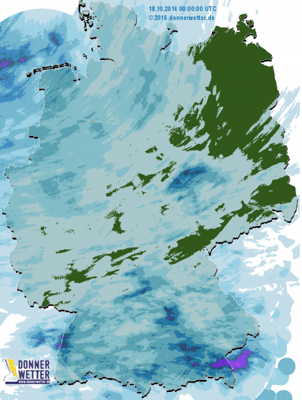 Gestern war es schon überall nass. Nur der Osten blieb noch bis Mitternacht trocken. Jetzt regnet es natürlich auch auf Rügen und in Berlin.