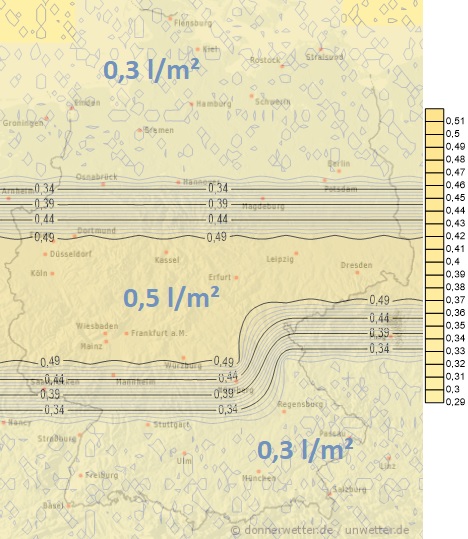 Am Sonntag kommt von Westen ein weiteres kräftiges Niederschlagsgebiet auf, dabei fällt zunächst verbreitet Schnee, der später durch Zufuhr milderer Luft zumindest in tieferen Lagen wieder in Regen übergeht. Es muss verbreitet mit Glätte auf Straßen und Gehwegen gerechnet werden. Die Niederschlagsmengen liegen zwischen 5 und 15 Liter pro Quadratmeter. Lediglich im Nordosten des Landes bleibt es zunächst noch trocken.