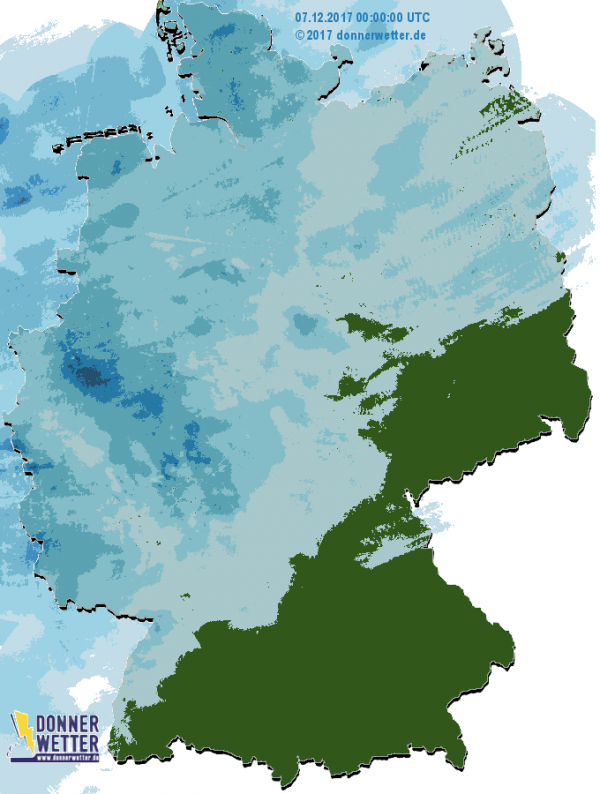 Heute wird es wieder winterlicher mit Schnee, Schneeregen und örtlichen Graupelgewittern. In Süddeutschland fällt auch länger andauernder Niederschlag, der allmählich bis in tiefere Lagen in Schnee übergeht. Die Niederschlagsmengen liegen meistens zwischen 5 und 15 Liter pro Quadratmeter. In den Bergen gibt es größere Neuschneemengen. Im Nordosten des Landes bleibt es längere Zeit trocken.