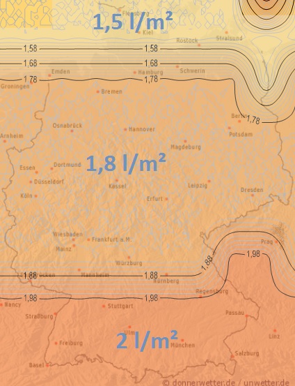 Heute wird es oft sehr warm und schwül, nachmittags ziehen von Westen verbreitet Regengüsse und Gewitter auf, die örtlich auch wieder kräftig ausfallen können und in der Nacht auch die östlichen Landesteile und Bayern erreichen. Dabei können örtlich über 20 Liter pro Quadratmeter fallen.