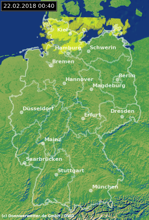 Das Radarbild zeigt aktuell in Schleswig-Holstein, sowie über der Ostsee schwache Signale mit Flocken. Auch am Alpenrand fallen örtlich Flocken. Sonst ist der Himmel über Deutschland teils bewölkt, teils sternenklar.