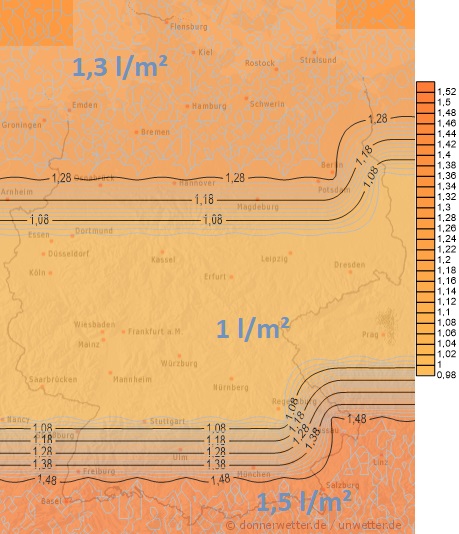 Heute wandert eine Regenzone von Westen allmählich in die Mitte von Deutschland. Gebietsweise kann es auch zu stärkeren Schauern in Verbindung mit Blitz und Donner kommen. Dabei können Niederschlagsmengen zwischen 10 und 20 Liter pro Quadratmeter, örtlich auch noch mehr auftreten.