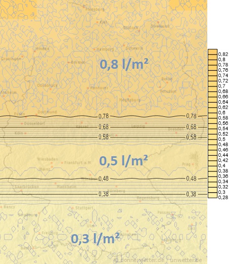 Von Dienstag bis Donnerstag ziehen weitere Schlechtwettergebiete mit Regen und Schauern über die Nordhälfte hinweg. Dabei können am Dienstag gebietsweise Mengen zwischen 5 und 15 Liter pro Quadratmeter gemessen werden, am Mittwoch und Donnerstag oft nur noch Mengen zwischen 1 und 7 Liter pro Quadratmeter. Im Süden bleibt es in der Regel niederschlagsfrei.