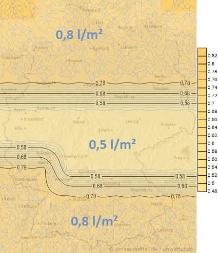 Am Donnerstag zieht eine vorläufig letzte Störungsfront mit leichtem Regen oder örtlichen Schauern bis in die Landesmitte hinein. Dabei fallen oft nur noch Mengen zwischen 1 und 7 Liter pro Quadratmeter. Im Süden bleibt es in der Regel niederschlagsfrei.