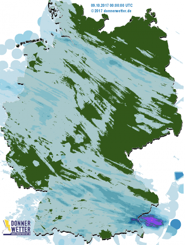 Das Radarbild zeigt aktuell noch örtliche meist leichte Niederschlagssignale. Sonst ist der Himmel über Deutschland meistens wolkenverhangen und nur selten aufgelockert.