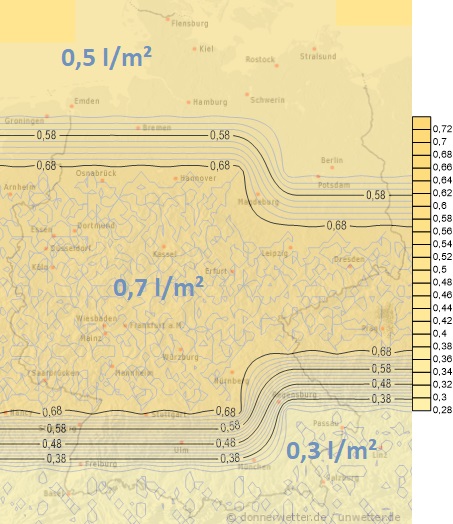 Am Donnerstag zieht von Westen neuer Niederschlag auf, dabei fällt anfangs Schnee oder auch gefrierender Regen, anschließend bei leichter Milderung Regen. Die Niederschlagsmengen liegen meist zwischen 1 und 10 Liter pro Quadratmeter. Ganz im Osten bleibt es zunächst noch trocken.