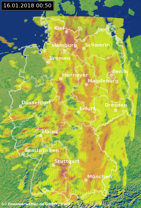 Heute und in den nächsten Tagen geht es ziemlich durchwachsen weiter. Häufig fällt Regen oder Schnee mit täglichen Mengen zwischen 5 und 20 Liter pro Quadratmeter, regional auch deutlich mehr, örtlich kann es blitzen und donnern, lediglich im Nordosten bleibt es am Mittwoch überwiegend trocken, phasenweise wird es sehr windig, am Donnerstag drohen Sturm und Orkanböen! Im Bergland können bis zum Wochenende größere Neuschneemengen fallen. Aufgepasst, die Pegel an Bächen und kleineren Flüssen können wieder spürbar anschwellen.