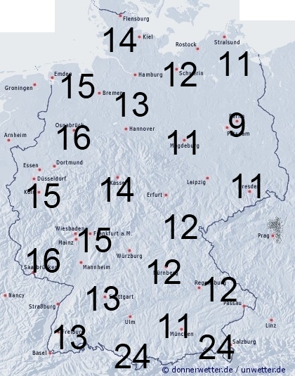 Gegen Mittag kommen von Westen neue Niederschläge auf. Sonst sorgt Feuchtigkeit, wie Tau- oder Reifansatz für Benetzung. Die Benetzungsdauer liegt in Deutschland im Osten zwischen 9 und 12 Stunden, im Westen zwischen 13 und 16 Stunden. Bei einer vorhandenen Schneedecke können bis zu 24 Stunden erreicht werden.