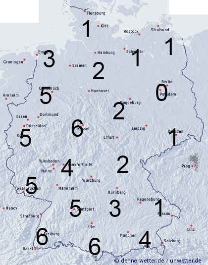 Die Benetzungsdauer liegt in großen Teilen Deutschlands durch Schauer und Gewitter, die von Südwesten aufziehen meist zwischen 2 und 6 Stunden, örtlich können aber auch mehr Stunden erreicht werden. Im Nordosten bleibt es meistens noch trocken. Leichte Benetzung entsteht hier nur durch nächtlichen Strahlungstau.