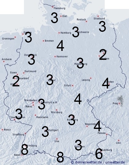 Im Südschwarzwald, am Bodensee und an den Alpen kann es zu örtlichen Regengüssen und Gewittern kommen. Sonst entsteht leichte Benetzung nur durch nächtlichen Strahlungstau. Die Benetzungsdauer liegt in Deutschland allgemein zwischen 2 und 5 Stunden, bei Regengüssen ganz im Süden und Südwesten können zwischen 5 und 9 Stunden erreicht werden.