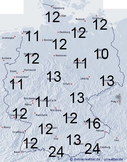 In Deutschland herrscht verbreitet teils neblig-trübes Wetter, vor allem im Norden kann es etwas regnen oder nieseln. Sonst entsteht Benetzung durch Feuchtigkeit wie Tauansatz. Die Benetzungsdauer liegt allgemein zwischen 10 und 16 Stunden. Bei einer Schneedecke in höheren Lagen können bis zu 24 Stunden erreicht werden.