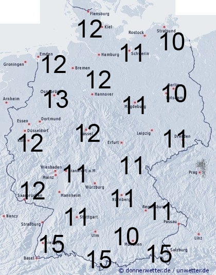 Es kommt zu weiteren Niederschlägen, die im Zustrom kälterer Luft wieder bis in mittlere Lagen mit Schnee vermischt sein können. Die Benetzungsdauer liegt in Deutschland allgemein zwischen 10 und 15 Stunden, regional können auch noch mehr erreicht werden.