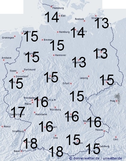 In Deutschland kommt es bei einem lebhaftem Wind verbreitet zu teils schauerartigen Regenfällen, im Bergland kann der Niederschlag auch als Schnee fallen. Die Benetzungsdauer liegt in der Regel zwischen 13 Stunden im Nordosten unseres Landes und 18 Stunden im Schwarzwald und Allgäu. Bei einer vorhandenen Schneedecke in den Bergen können bis zu 24 Stunden erreicht werden.