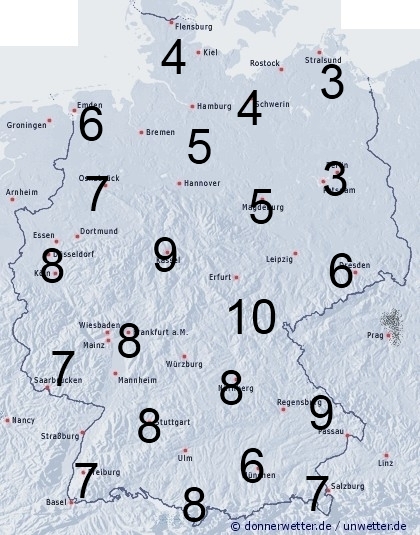 In Deutschland treten örtlich teils kräftige Schauer und Gewitter auf. Am ehesten niederschlagsfrei bleibt es in Teilen Nordostdeutschlands. Sonst entsteht leichte Benetzung durch nächtlichen Strahlungstau. Die Benetzungsdauer liegt im Nordosten und in Gebieten wo kaum Schauer auftreten zwischen 3 und 5 Stunden, sonst werden zwischen 5 und 10 Stunden erreicht.