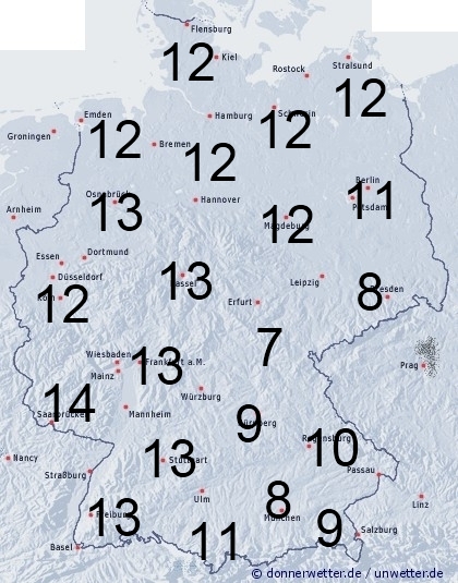 Benetzungs in Deutschland wird ausgelöst durch leichten Regen, der zum Abend vor allem in der Westhälfte auftritt, Tau, bzw. Reif, sowie örtliche Nebelnässe. Die Benetzungsdauer liegt dabei allgemein zwischen 7 und 10 Stunden im Südosten und 11 bis 14 Stunden im Rest unseres Landes.