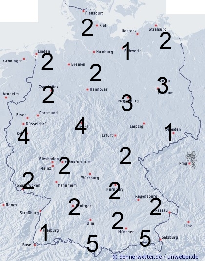 In Deutschland fällt gebietsweise Regen, oder es treten einige Schauer, vereinzelt auch Gewitter auf. Die Benetzungsdauer liegt in der Regel zwischen 2 und 5 Stunden. Sonst bleibt es trocken und leichte Benetzung entsteht durch nächtlichen Strahlungstau.