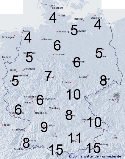 Gebietsweise muss mit Regengüssen und örtlichen Gewittern gerechnet werden. Überwiegend trocken bleibt es lediglich ganz im Norden und Nordwesten. Sonst entsteht leichte Benetzung auch durch nächtlichen Strahlungstau. Die Benetzungsdauer liegt im Norden und im Westen in der Regel zwischen 4 und 6 Stunden, sonst zwischen 6 und 12 Stunden, am Alpenrand zum Teil auch bis 15 Stunden.