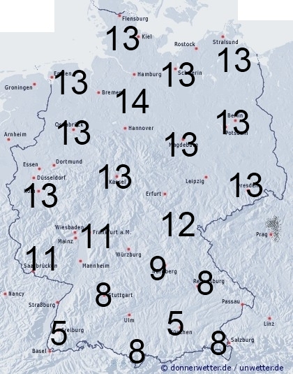 Ein Regengebiet zieht von Norden in die Mitte unseres Landes. Sonst entsteht Benetzung durch Feuchtigkeit wie Tauansatz. Allgemein liegt die Benetzungsdauer im Norden und in der Mitte zwischen 11 und 14 Stunden, im Süden zwischen 5 und 10 Stunden. Bei einer vorhandenen Schneedecke in den Bergen können bis zu 24 Stunden erreicht werden.