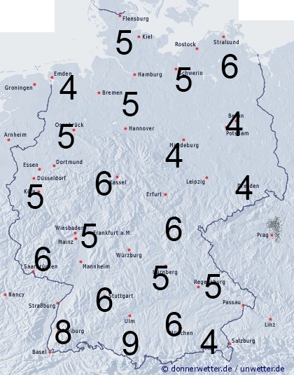 Von Westen her ziehen Regenfälle und Schauer über Deutschland hinweg und sorgen für eine Benetzungsdauer von meist 4 bis 9 Stunden. Im Süden kann es auch zu Gewittern kommen.