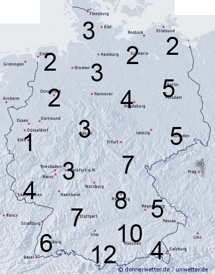 Vor allem im Süden fällt zum Teil kräftiger schauerartiger Regen, örtlich mit Blitz und Donner. Die Benetzungdauer liegt dabei meist zwischen 6 und 12 Stunden. Sonst halten sich mit einer Benetzungszeit von 1 bis 5 Stunden Regengüsse in Grenzen.