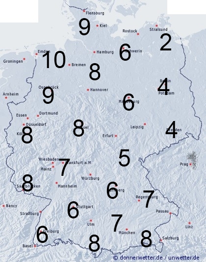 Von West nach Ost ziehen Regen- und Schauerwolken über Deutschland hinweg. Die Benetzungsdauer erreicht dabei zwischen 5 und 10 Stunden. Im Nordosten regnet es seltener. Hier liegt die Benetzungsdauer meist nur zwischen 2 und 4 Stunden.