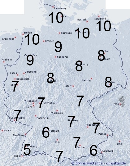Von Nordwest nach Südost zieht ein Regengebiet über Deutschland hinweg, dahinter stellt sich vor allem im Norden windiges und kühles Schauerwetter ein. Die Benetzungsdauer erreicht meist zwischen 5 und 10 Stunden. Die höheren Werte findet man dabei im Norden.