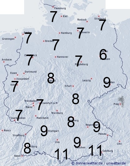 Eine Regenzone überquert Deutschland von Nord nach Süd. Desweiteren kommt es auch durch Tau zu Benetzung. Die Benetzungsdauer liegt allgemein zwischen 6 und 11 Stunden, kann aber außerhalb von Ortschaften in geschützten Lagen noch deutlich nach oben abweichen.