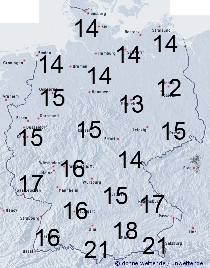 Ein Regengebiet zieht über Deutschland hinweg und sorgt für Benetzung. Außerdem entsteht Benetzung durch hohe Luftfeuchtigkeit mit Tauansatz. Die Benetzungsdauer liegt in Deutschland allgemein zwischen 12 und 17 Stunden, am Alpenrand können auch 18 bis 21 Stunden erreicht werden.