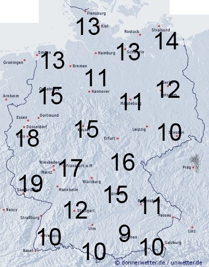 Regen fällt heute vor allem über der Landesmitte über weite Strecken des Tages. Sonst entsteht Benetzung auch durch nächtlichen Tauansatz. Die Benetzungsdauer liegt in Deutschland allgemein zwischen 9 und 15 Stunden, im Westen, sowie über der Landesmitte auch zwischen 15 und 20 Stunden. Bei einer noch vorhandenen Schneedecke in den Bergen werden bis 24 Stunden erreicht.