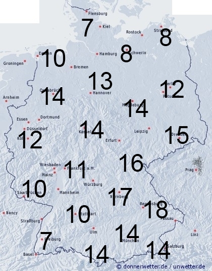 Über Deutschland fällt verbreitet Regen. Lediglich im Breisgau, sowie in Mecklenburg-Vorpommern bleibt es überwiegend niederschlagsfrei. Hier entsteht Benetzung durch Feuchtigkeit und Tau. Die Benetzungsdauer liegt allgemein bei Regen zwischen 10 und 18 Stunden. Dort wo es meistens niederschlagsfrei bleibt werden 7 bis 9 Stunden erreicht.