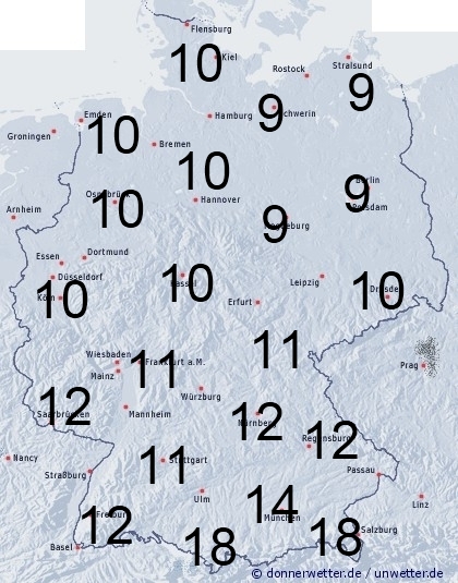 Vor allem im Süden fällt noch längere Zeit Regen, sonst nur gelegentlich. Die Benetzungsdauer liegt zwischen 9 und 11 Stunden im Norden, sowie 12 bis 18 Stunden im Süden.