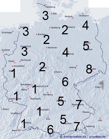 Vor allem in Sachsen und Bayern treten vermehrt gewittrige Regengüsse auf. Sonst gehen örtliche Schauer nieder. Im Südwesten bleibt es oft trocken. Die Benetzungsdauer erreicht in der Regel 2 bis 8 Stunden. Die höheren Werte findet man in Sachsen und in Bayern.