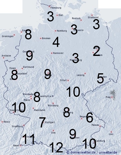 Gebietsweise muss mit teils kräftigen Schauern und Gewittern gerechnet werden. In Schleswig - Hollstein und im Nordosten bleibt es meistens trocken. Sonst entsteht leichte Benetzung durch nächtlichen Strahlungstau. Die Benetzungsdauer liegt allgemein in Deutschland zwischen 5 und 12 Stunden, dort wo es jedoch niederschlagsfrei bleibt werden kaum mehr als 2 bis 5 Stunden erreicht.