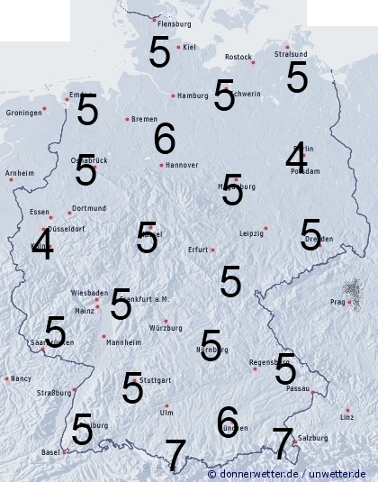 An den Alpen fällt stellenweise etwas Regen. Sonst entsteht leichte Benetzung durch nächtlichen Strahlungstau. Die Benetzungsdauer liegt in Deutschland allgemein zwischen 4 und 7 Stunden.