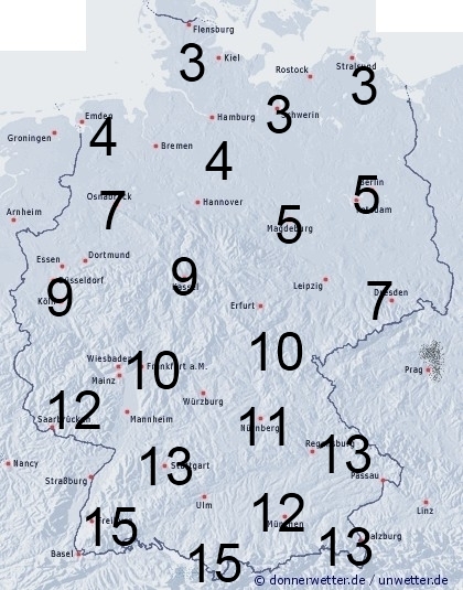 Im Norden und Nordosten bleibt es meistens trocken. Sonst muss mit teils kräftigen Regengüssen und Gewittern gerechnet werden. Außerdem entsteht leichte Benetzung durch nächtlichen Strahlungstau. Die Benetzungsdauer liegt im Norden und Nordosten zwischen 3 und 5 Stunden, sonst werden bei unterschiedlich auftretenden Schauern zwischen 5 und 13 Stunden, im Schwarzwald und an den Alpen können teilweise auch 15 Stunden erreicht werden.