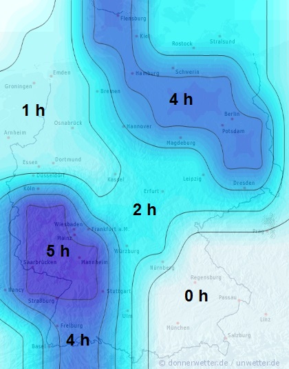 Wir stellen die Blattbenetzung generell in Stunden pro Tag auf der Karte dar. Durch die Lage des Feldes kann die Benetzungsdauer allerdings variieren.