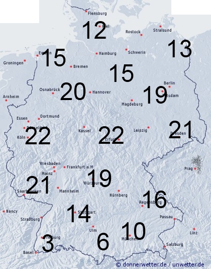 Die Benetzungsdauer liegt in den Gebieten mit einer noch vorhandenen Schneedecke in den Bergen bei 24 Stunden. Sonst sind es bei Dauerregen in der Mitte des Landes zum Teil über 20 Stunden. Nach Norden und Süden nimmt die Benetzung ab. Im Breisgau und im Alpenvorland werden deutlich weniger als 10 Stunden erwartet.