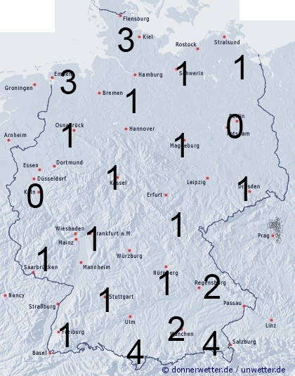 Im Küstenbereich und in Schleswig-Holstein kann es zu etwas Regen, oder einigen Schauern mit einer Benetzungszeit von 2 bis 3 Stunden kommen. Einzelne Schauer und Gewitter sorgen auch in Teilen Bayerns, sowie an den Alpen für eine Benetzungszeit von 2 bis 4 Stunden. Sonst entsteht leichte Benetzung nur durch nächtlichen Strahlungstau.