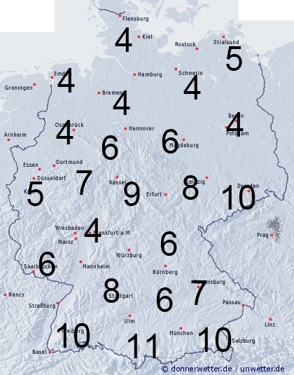 Die Benetzungsdauer liegt heute bei gelegentlichem Regen, oder Schauern zwischen 4 Stunden in Norddeutschland und 11 Stunden am Alpenrand.