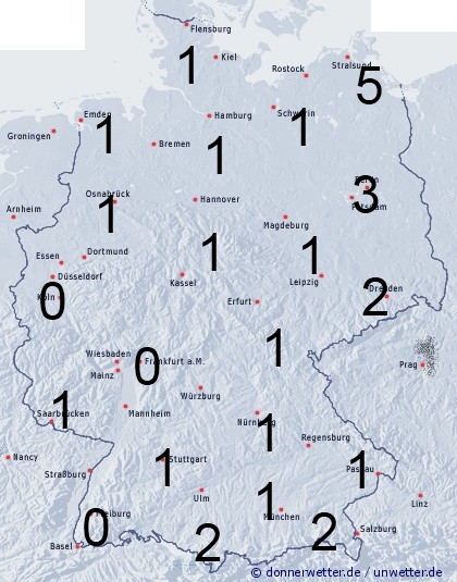 Nach Polen abziehender Regen sorgt vor allem im östlichen Mecklenburg-Vorpommern, sowie Brandenburg und Sachsen für eine Benetzung von 2 bis 5 Stunden. Sonst ist es in Deutschland überwiegend niederschlagsfrei. Leichte Benetzung entsteht nur durch nächtlichen Strahlungstau.