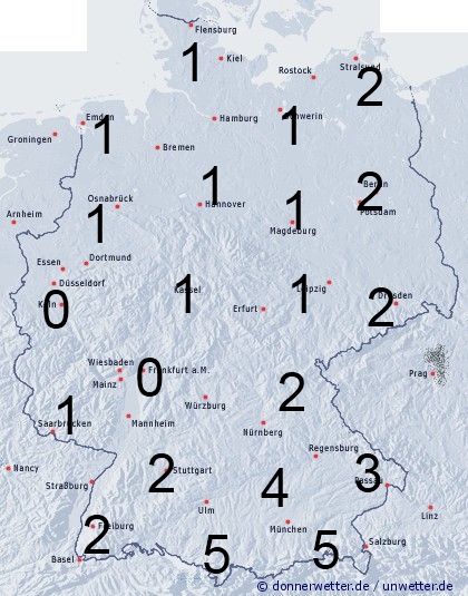 Vor allem im Osten und Süden können sich örtliche Schauer und Gewitter entwickeln. Hier liegt die Benetzungsdauer zwischen 2 und 6 Stunden. Sonst bleibt es meistens trocken. Leichte Benetzung entsteht nur durch nächtlichen Strahlungstau.