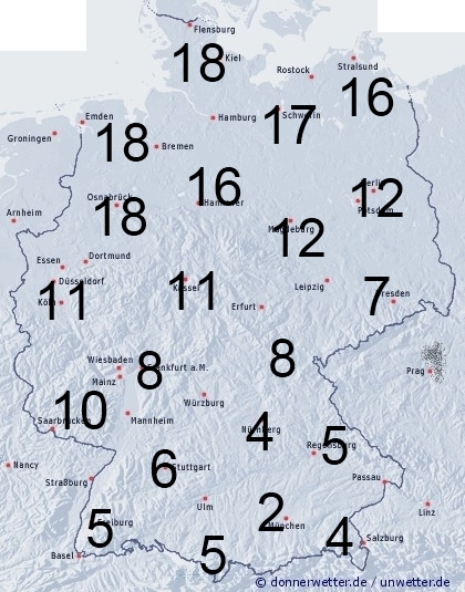 Im Norden und Westen regnet es für längere Zeit. Hier erreicht die Benetzungsdauer meist zwischen 10 und 18 Stunden. Ganz im Süden, sowie in Bayern bleibt es oft noch trocken. Hier entsteht Benetzung von 2 bis 5 Stunden meist nur durch nächtlichen Strahlungstau.
