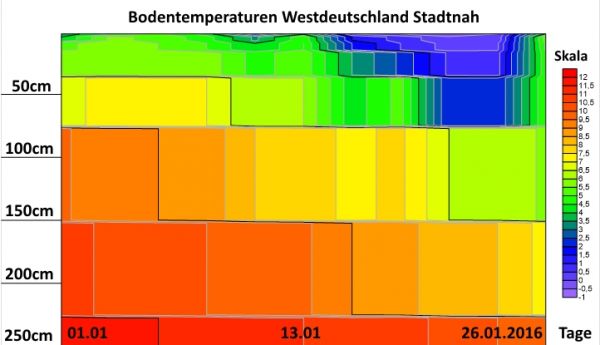 Bodentemperaturen vom 01.01.2016 bis zum 26.01.2016, für den Westen Deutschlands.
