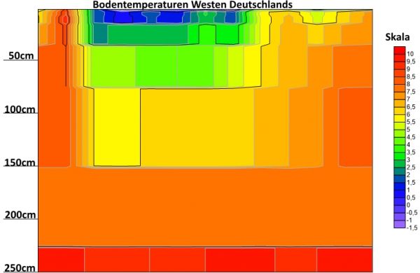 Bodentemperaturen vom 07.03.2016 bis zum 05.04.2016, für den Westen Deutschlands.