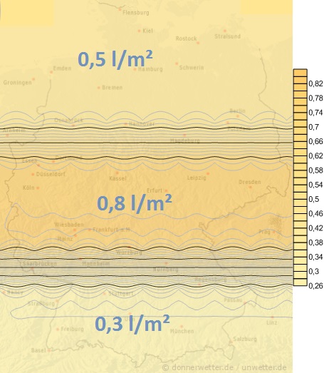Heute überquert uns von West nach Ost ein Regengebiet. Dabei können gebietsweise zwischen 10 und 25 Liter pro Quadratmeter fallen. Weniger wird es wohl im Emsland und in Schleswig-Holstein sein. Am Abend sinkt die Schneefallgrenze im Süden zum Teil unter 800 m.